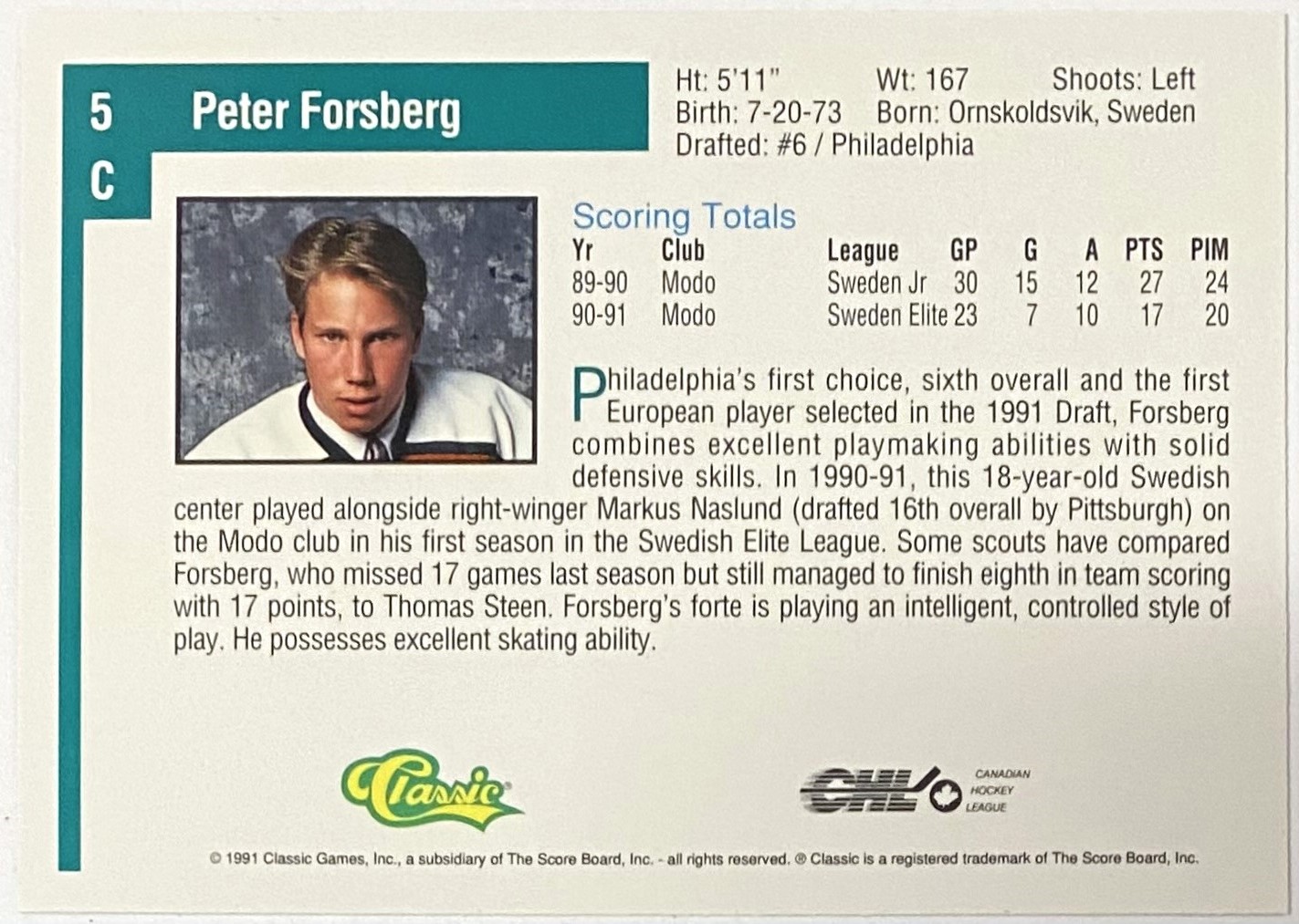 Peter Forsberg 1991 Classic Draft Picks Philadelphia Flyers Hockey